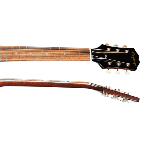El ultracómodo cuello de perfil “C” redondeado del Epiphone Hummingbird ha sido pegado y cuenta con una articulación del cuello de cola de milano cónica. La encuadernación de marfil antiguo a lo largo del cuello y los paralelogramas divididos de nácar vintage en el diapasón añaden detalles visuales aún más clásicos que harán las delicias. El diapasón de laurel indio es increíblemente suave y sensible, no te dejará ninguna duda de por qué el original en el que se inspiró se ha ganado una legión de guitarristas.
